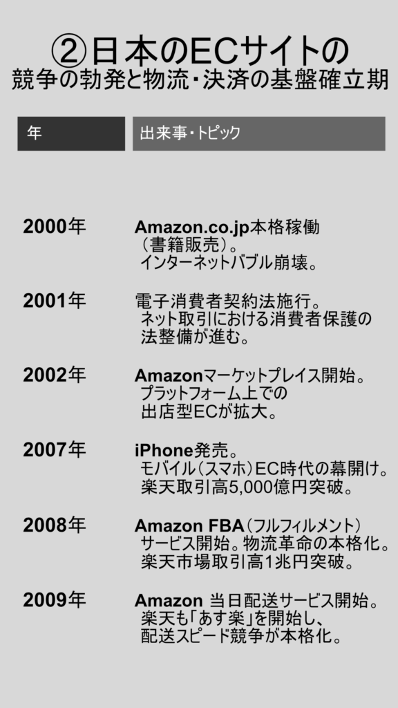 ②競争の勃発と物流・決済の基盤確立期(2000年〜2009年)→戦いの始まり