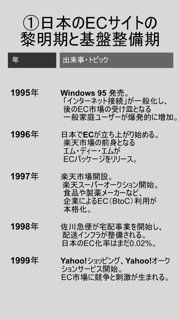 すべては、1995年のWindows 95発売から始まりました。これにより、インターネットは専門家のオモチャから、リビングの家電へと変わります。EC市場の「受け皿となるお客さん」が、爆発的に増えたのです。