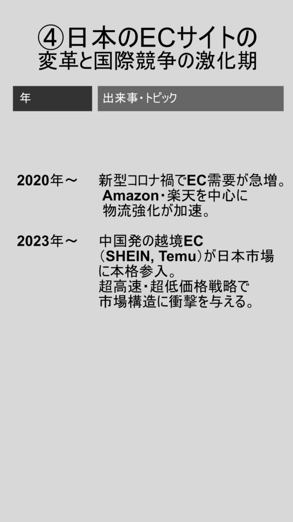 これにより、ECの競争軸は「価格が安いこと」から「翌日(当日)届くこと」へと完全に書き換えられました。この激しい決闘が、私たちの「待てない消費マインド」を形成したのです。
