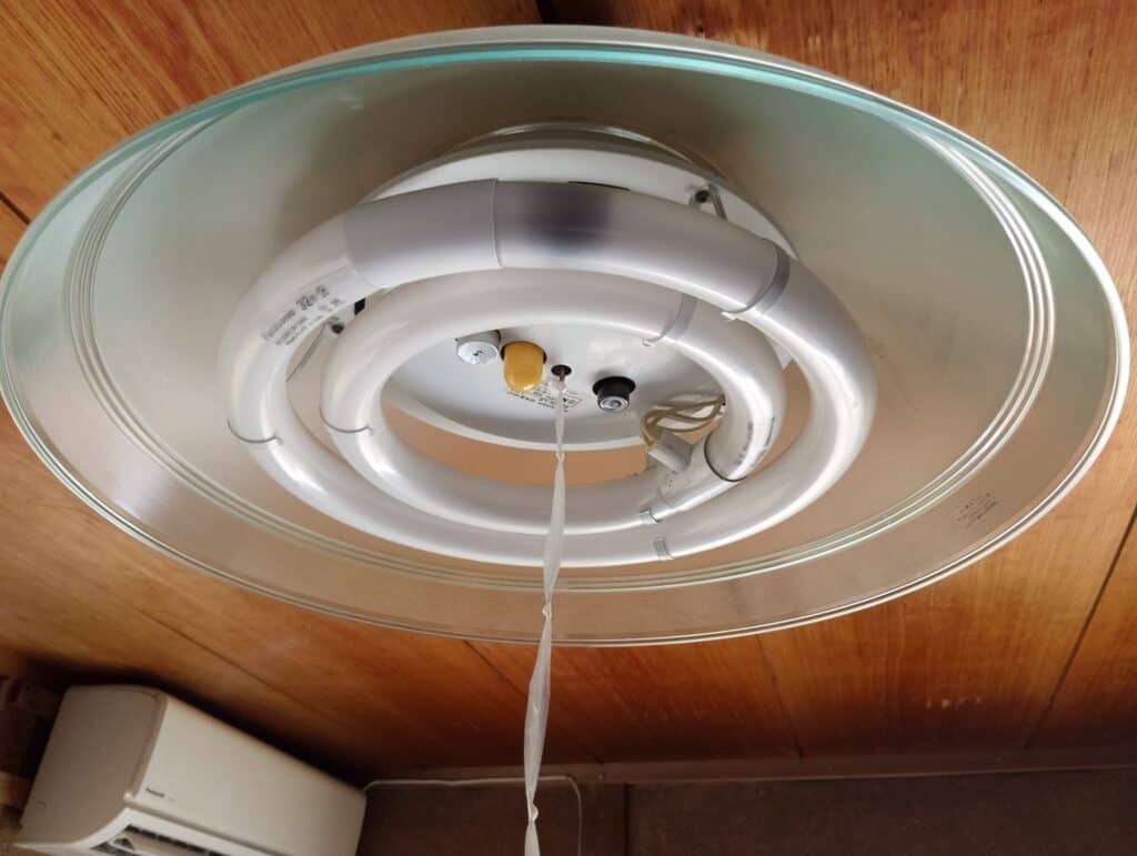 蛍光灯タイプのシーリングライトだったので、蛍光灯を交換すればよかったのですが、某社の細い特別仕様の蛍光灯だったため、1.5倍ほど価格が上がっていた夏に(Amazonで調べた)、いろいろ調べた結果、LED電球の散りばめられたシーリングライトに交換してしまったほうが、安上がりで、その後、長寿命が期待できることと、省エネ化等々、メリットがたくさんあったので蛍光灯タイプのシーリングライト機器は廃棄することになりました。
