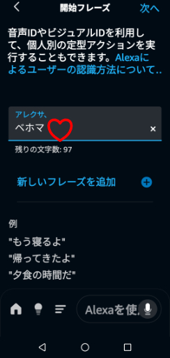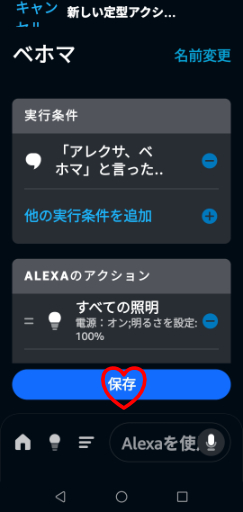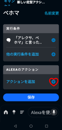 「実行条件を設定」で「音声」を選び、好きな呪文を入力します(例:「アレクサ、ベホマ」)。